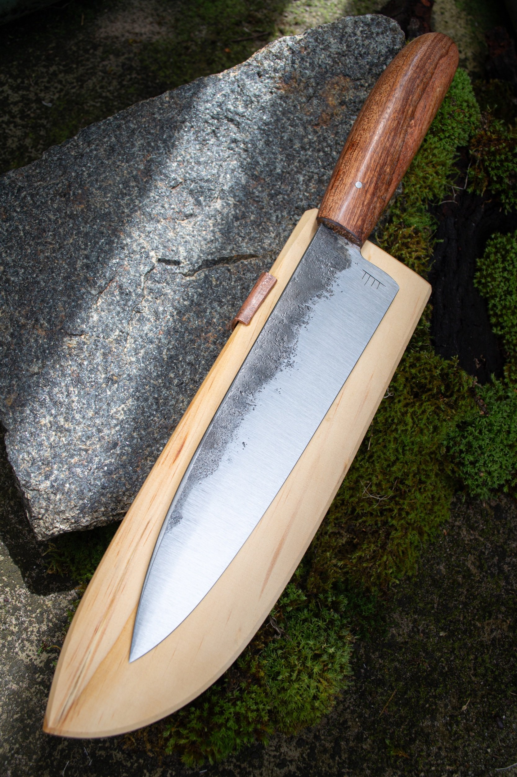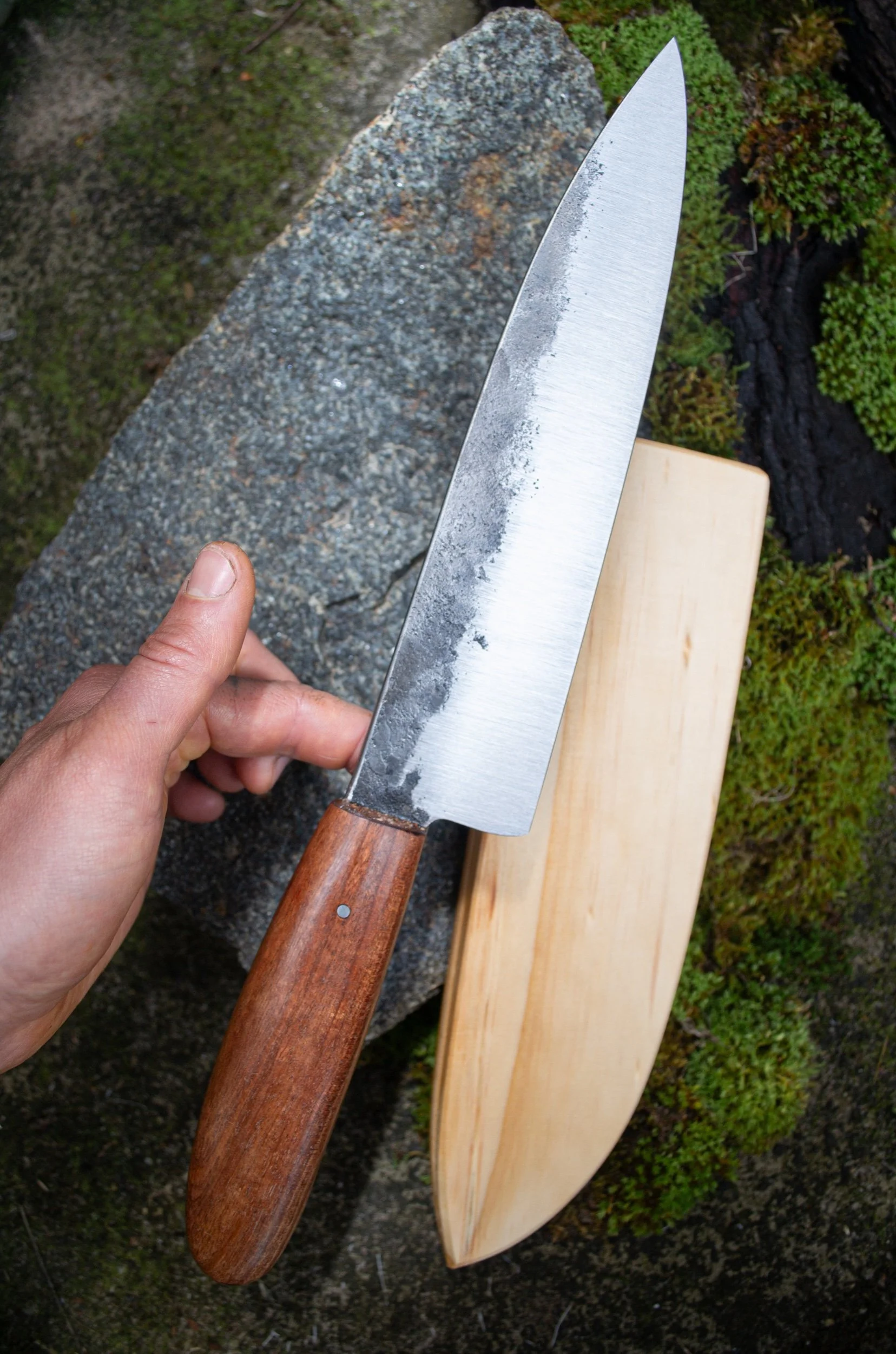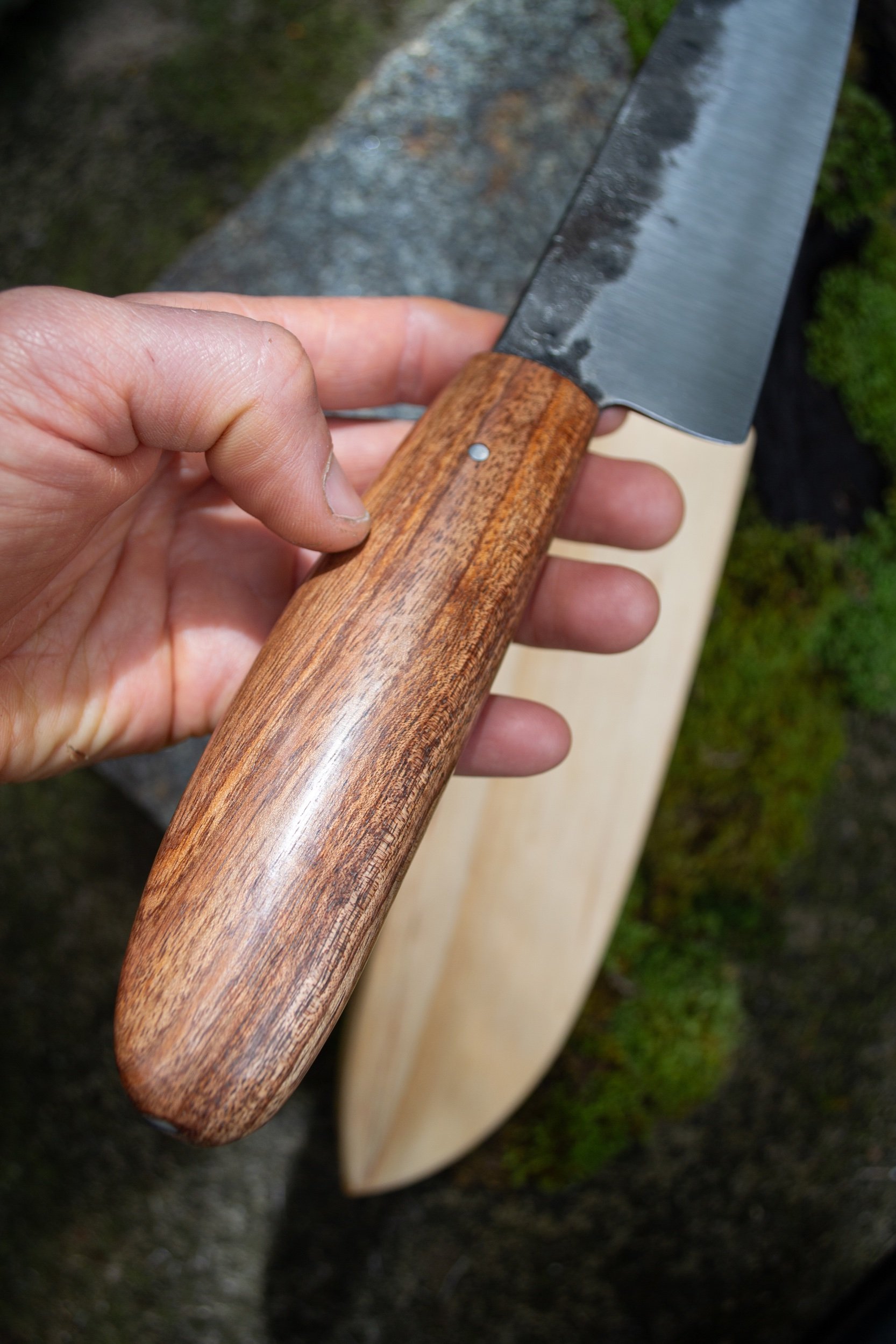 This kitchen wand has been hand forged entirely from recycled high carbon steel. It possesses a timber handle crafted from salvaged Tasmanian Blackwood timber. These incredibly durable materials have been transformed into an easy to use, ergonomic kitchen knife that can be utilised to cut up many types of foods. It is not designed to cut through bone. It has a blade length of 202mm and a handle length of 133mm. It has a spine thickness of 2mm and an HRC of approximately 59-60.