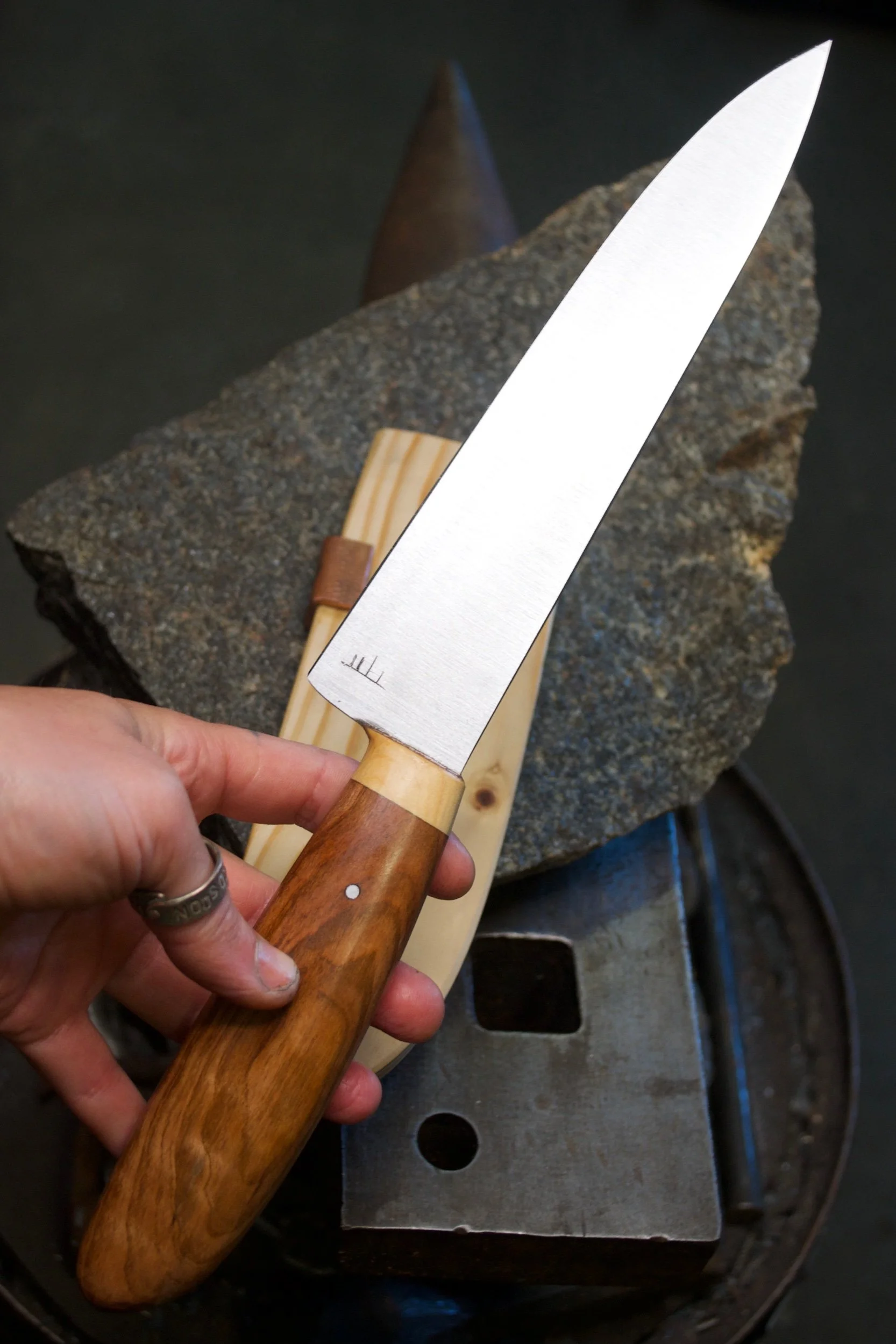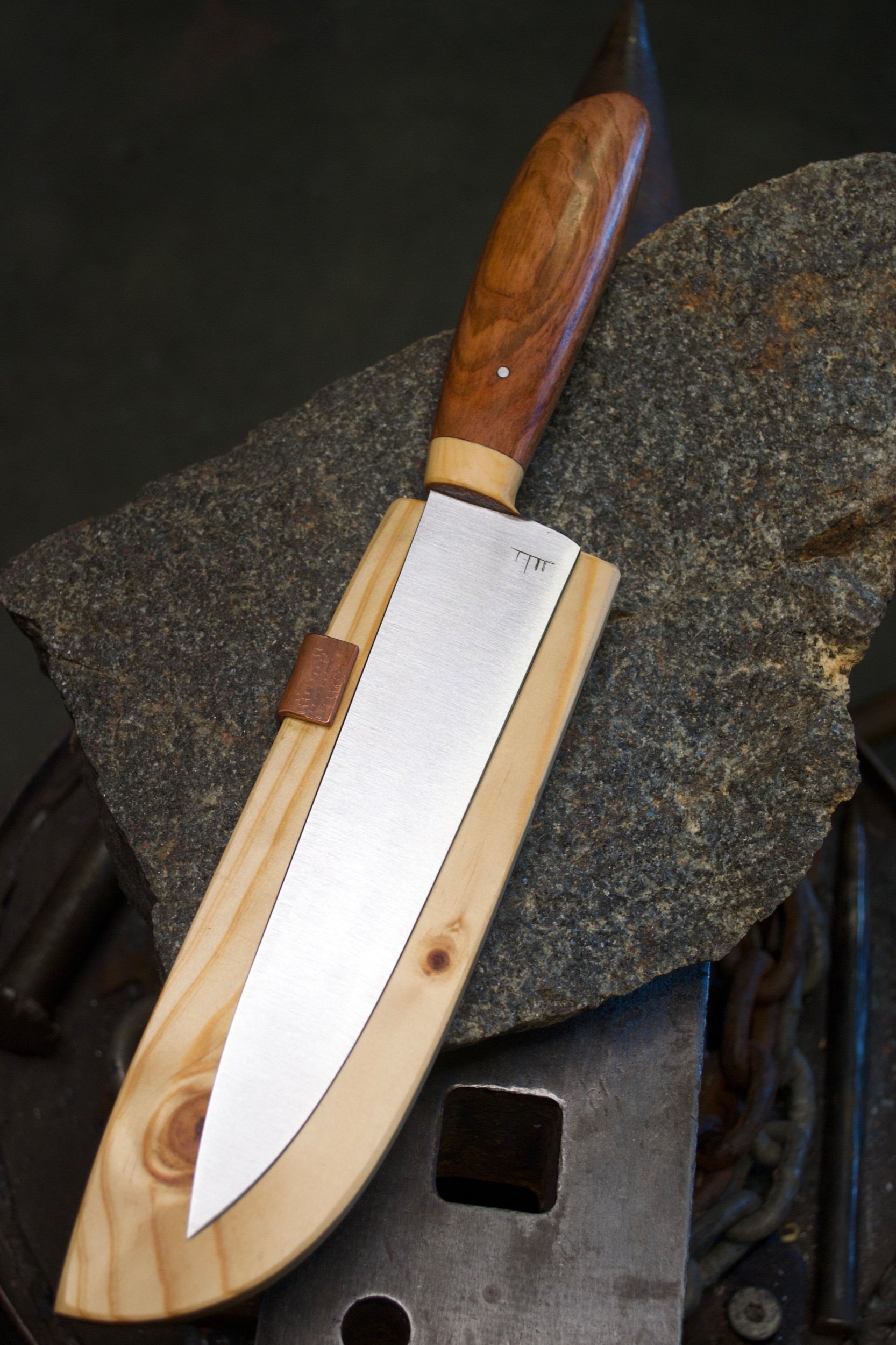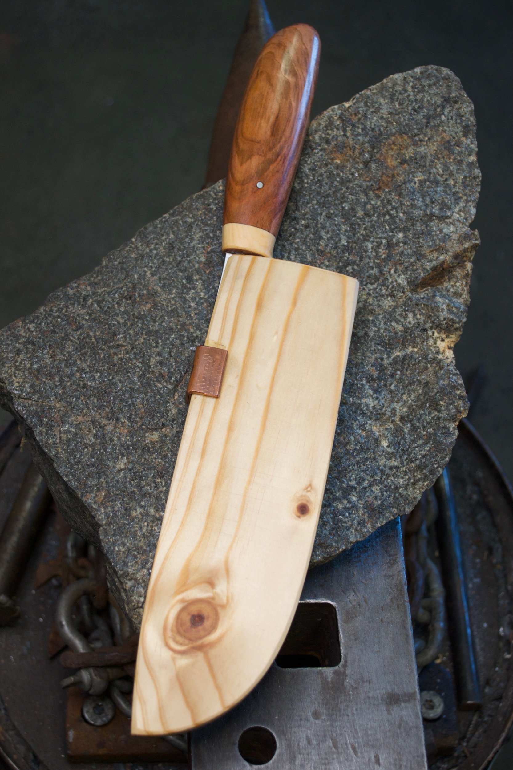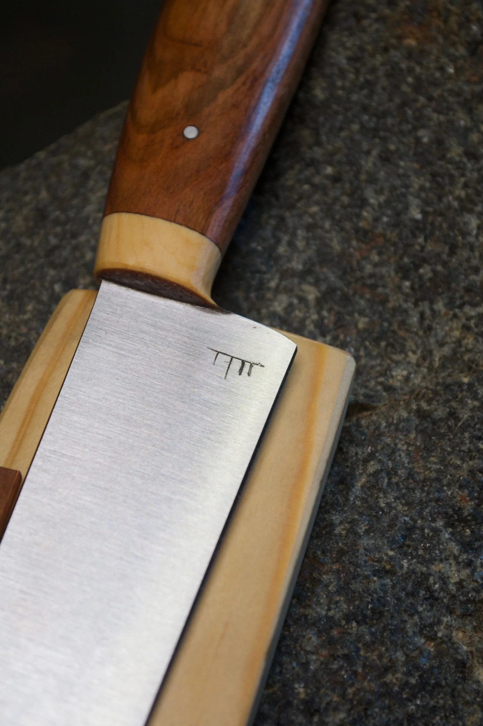This light weight kitchen wand has been hand forged entirely from recycled high carbon steel. It possesses a timber handle crafted from salvaged Myrtle beech and Huon pine timber. These incredibly durable materials have been transformed into an easy to use, light weight kitchen knife that can be utilised to cut up many types of foods. It is not designed to cut through bone. It has a blade length of 195mm and a handle length of 140mm. It has a spine thickness of 1.5mm and an HRC of approximately 59-60.
