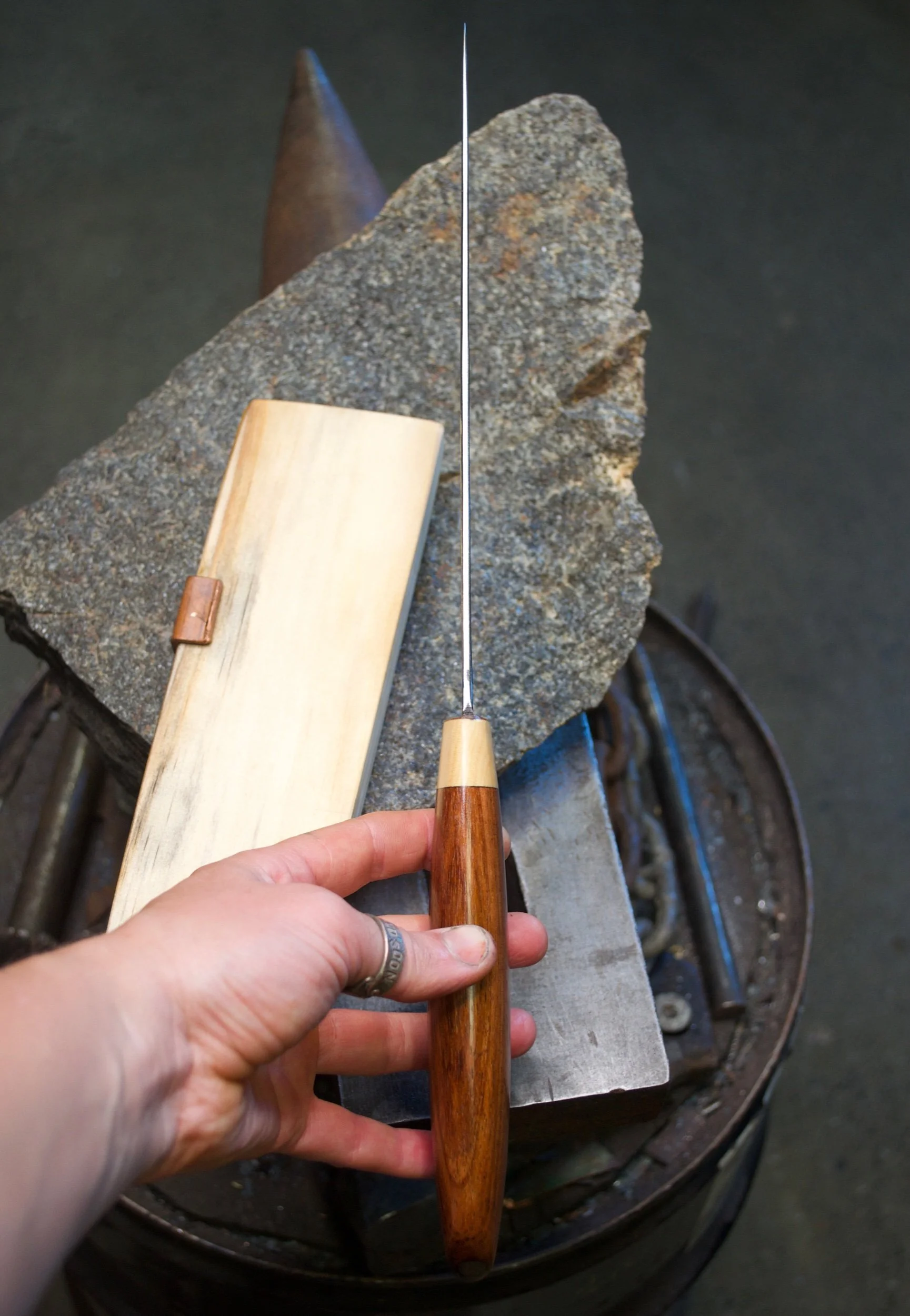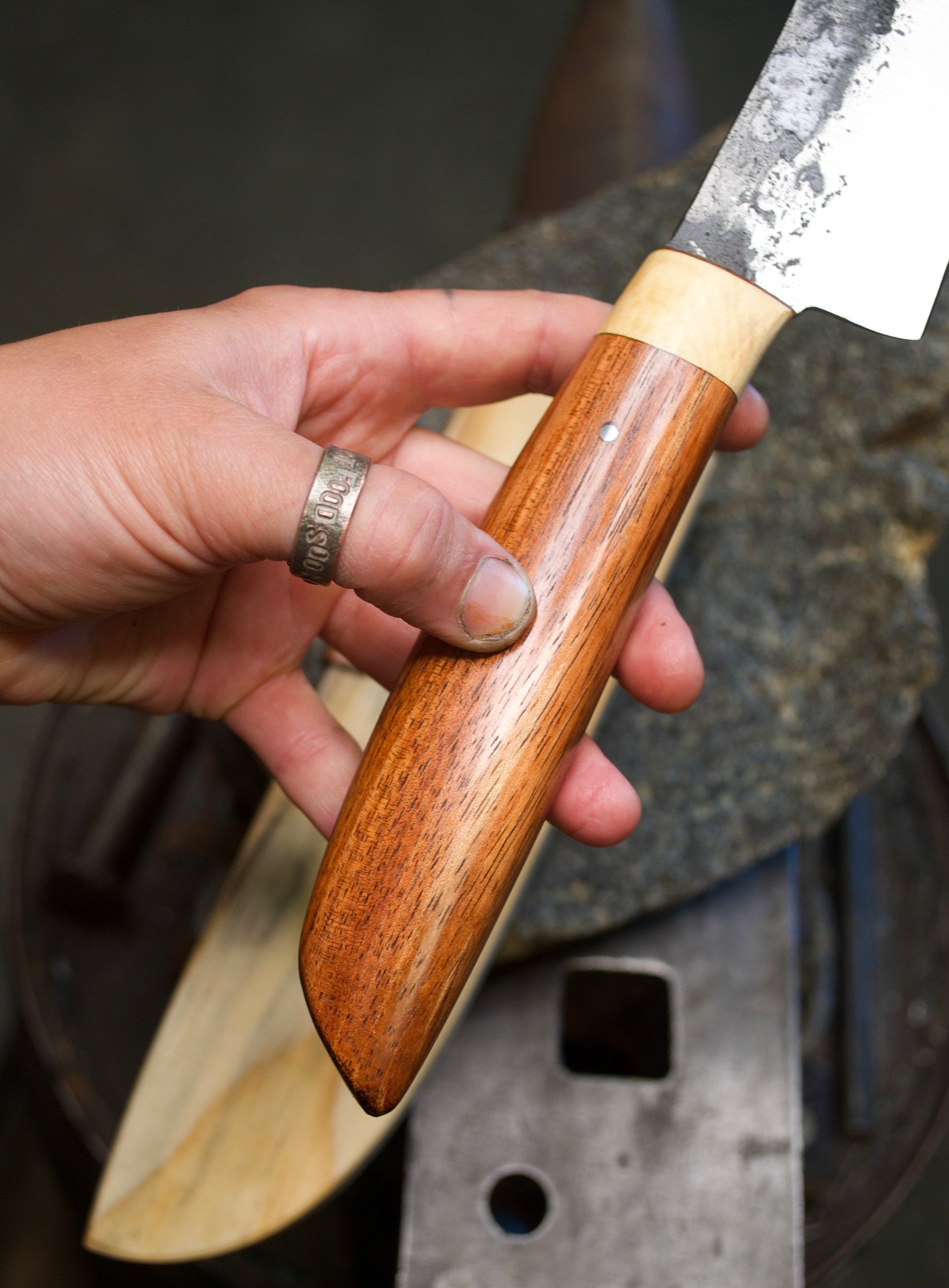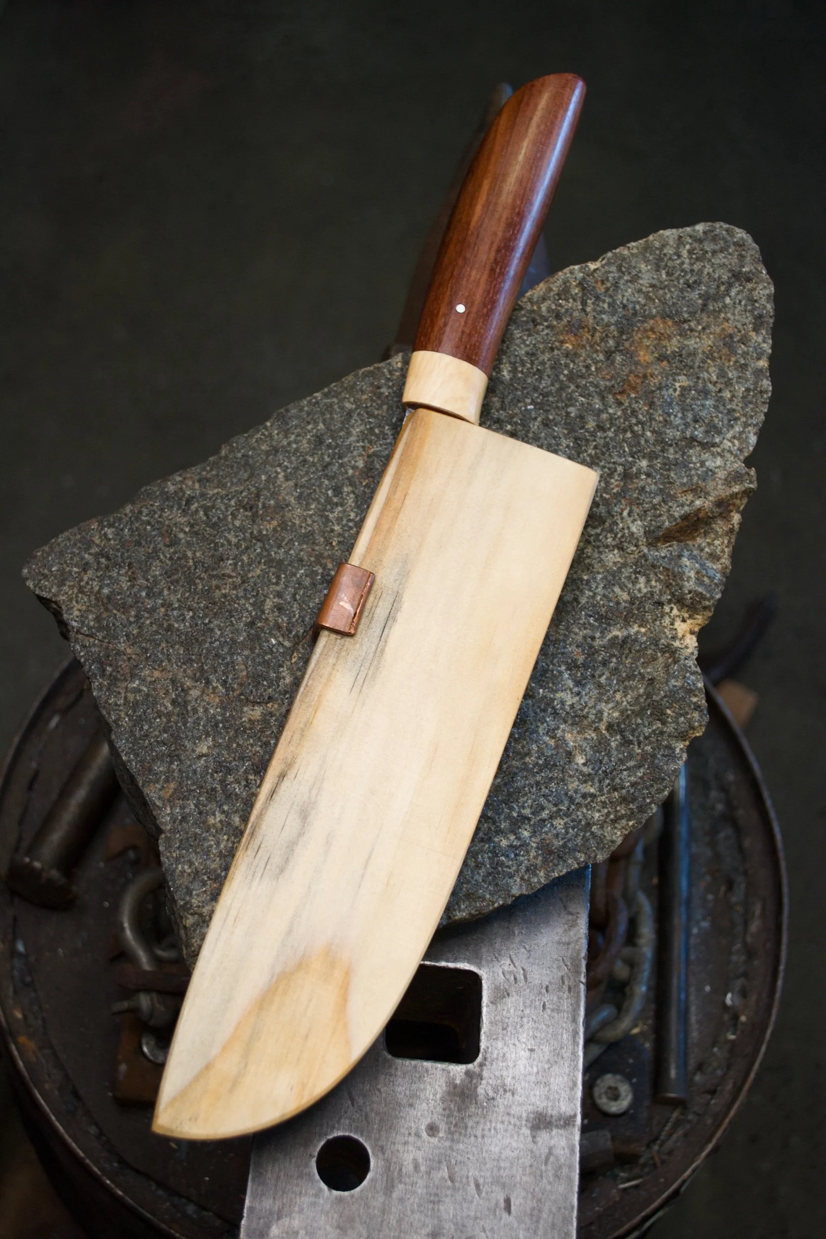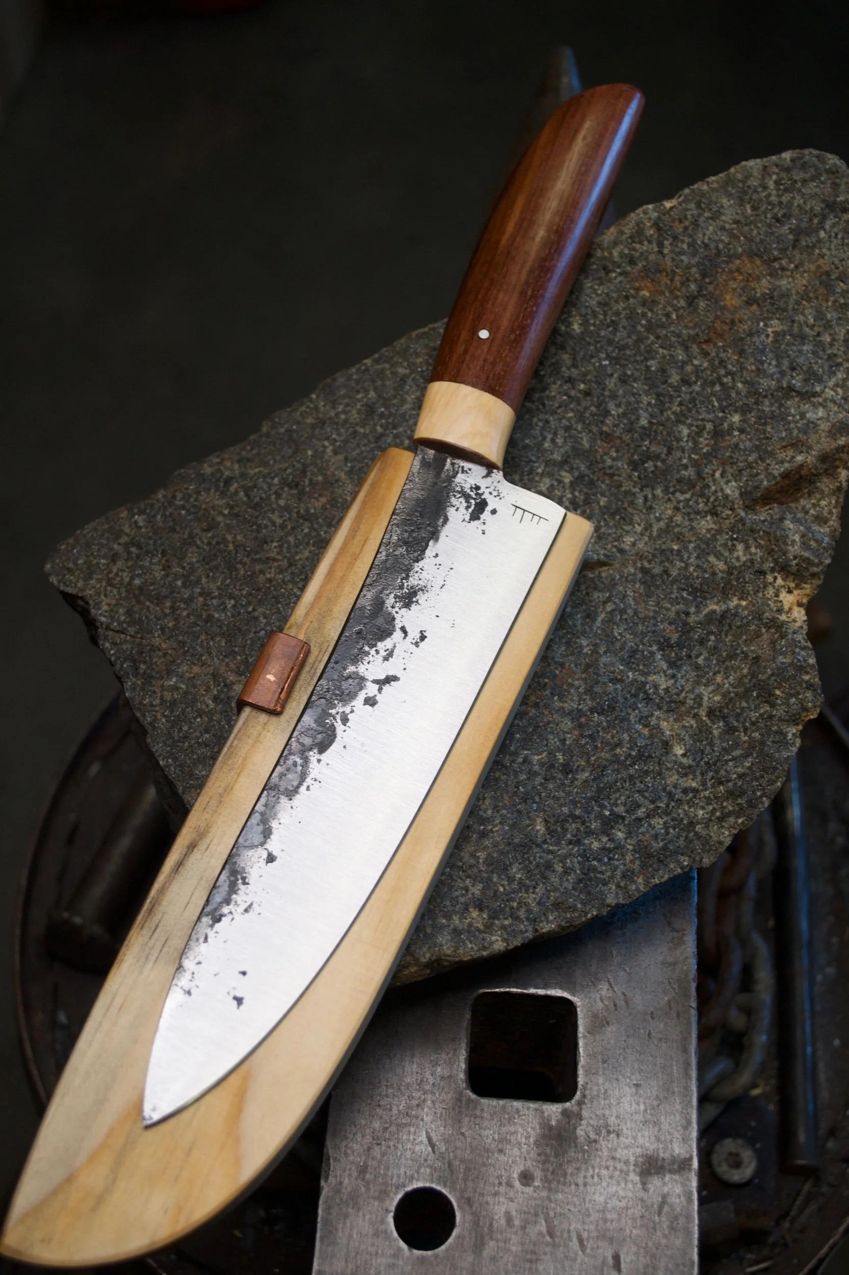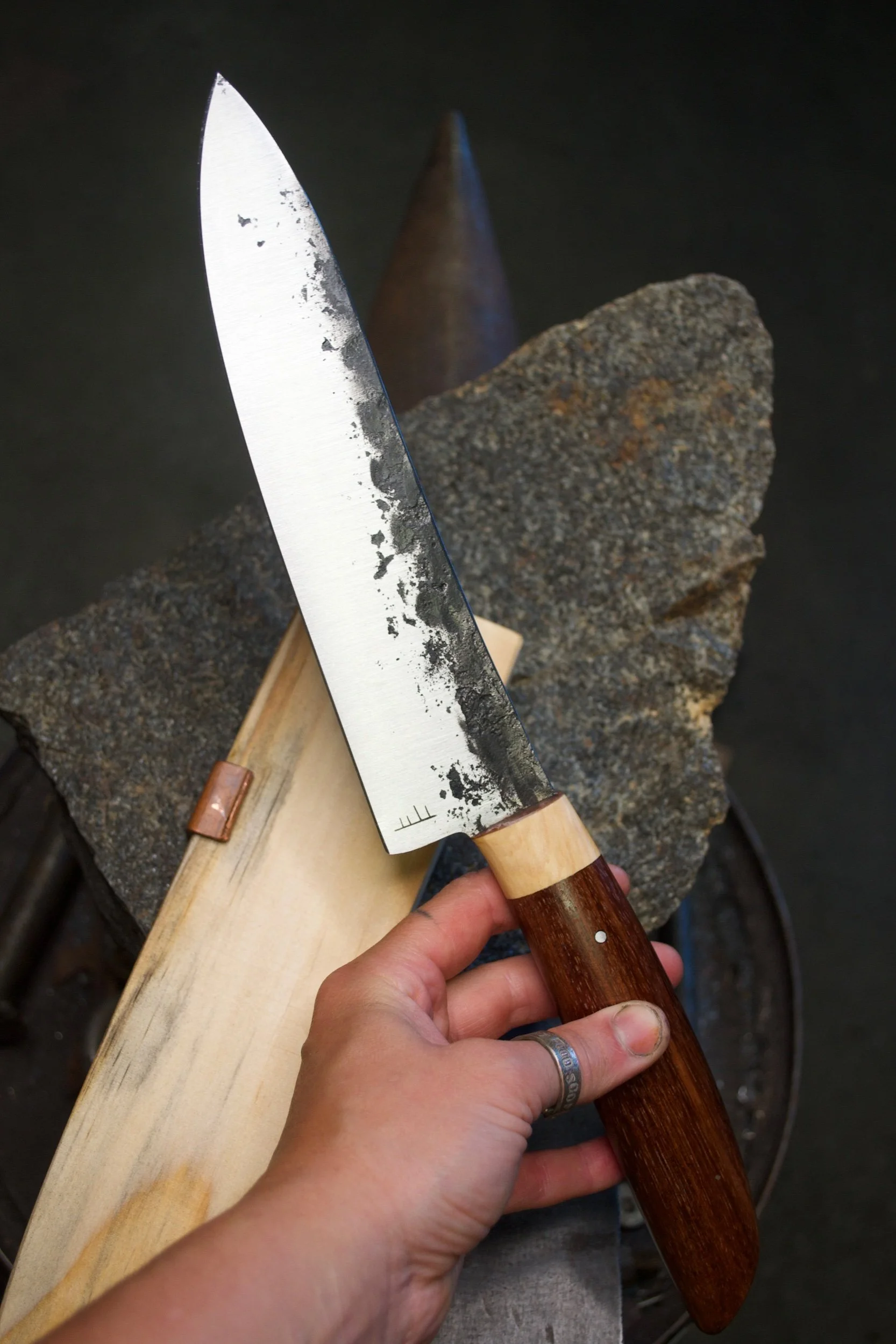 This kitchen wand has been hand forged entirely from recycled high carbon steel. It possesses a timber handle crafted from salvaged Tasmanian Blackwood and Huon pine timber. These incredibly durable materials have been transformed into an easy to use, ergonomic kitchen knife that can be utilised to cut up many types of foods. It is not designed to cut through bone. It has a blade length of 200mm and a handle length of 155mm. It has a spine thickness of 2mm and an HRC of approximately 59-60.