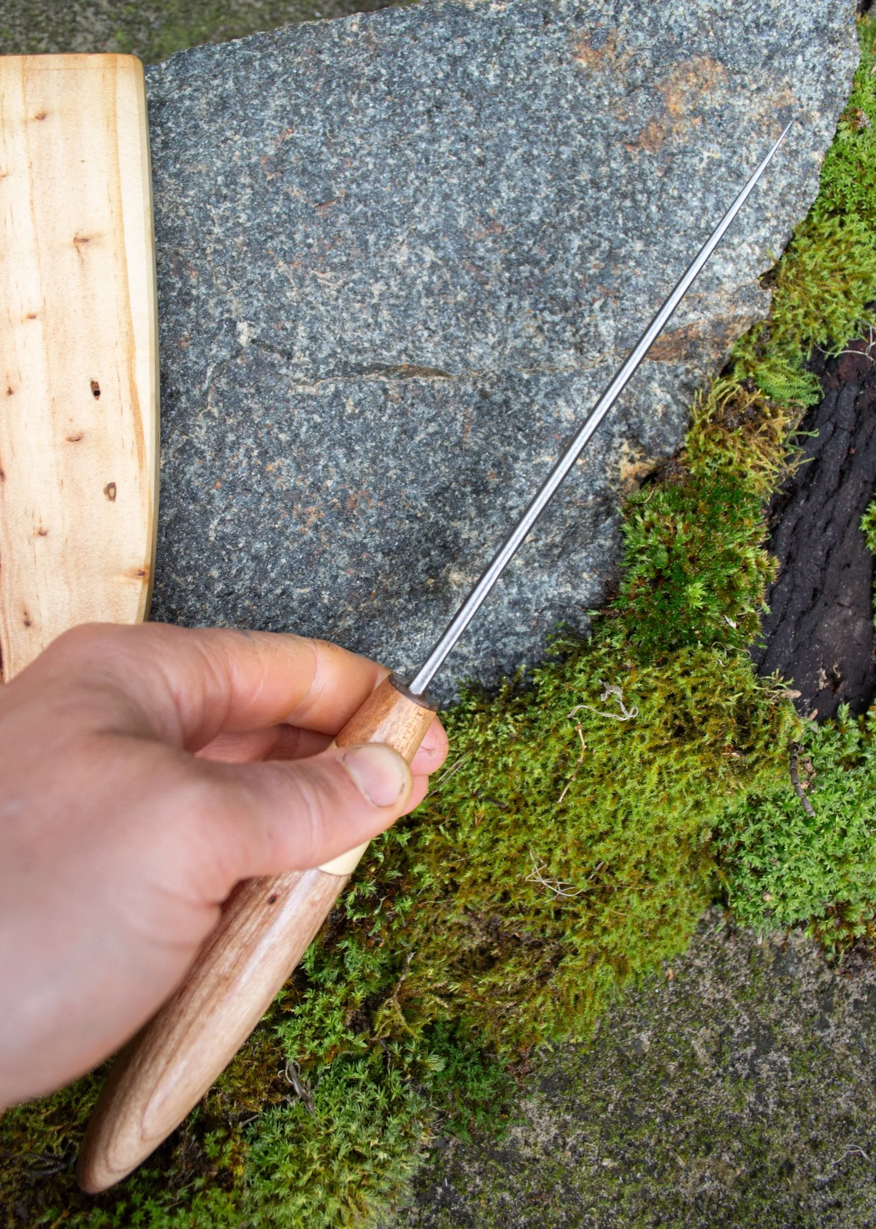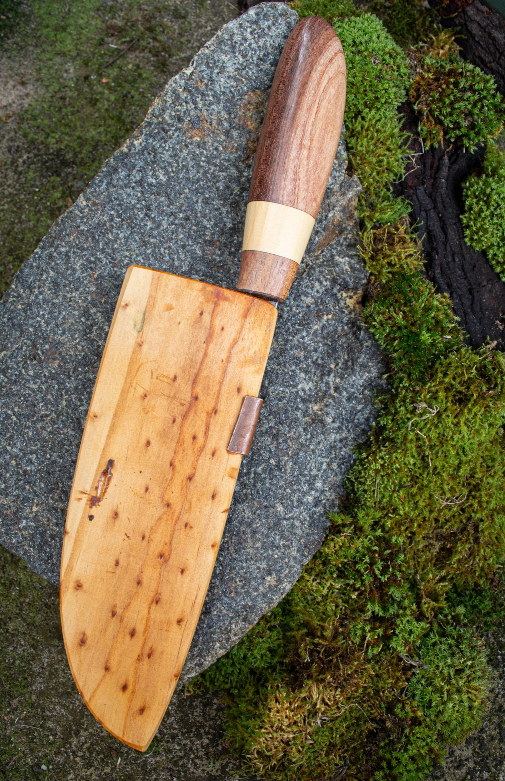 This kitchen wand has been hand forged entirely from recycled high carbon steel. It possesses a timber handle crafted from salvaged Tasmanian Blackwood and Huon pine timber. These incredibly durable materials have been transformed into an easy to use, ergonomic kitchen knife that can be utilised to cut up many types of foods. It is not designed to cut through bone. It has a blade length of 140mm and a handle length of 135mm. It has a spine thickness of 2.8mm and an HRC of approximately 59-60.