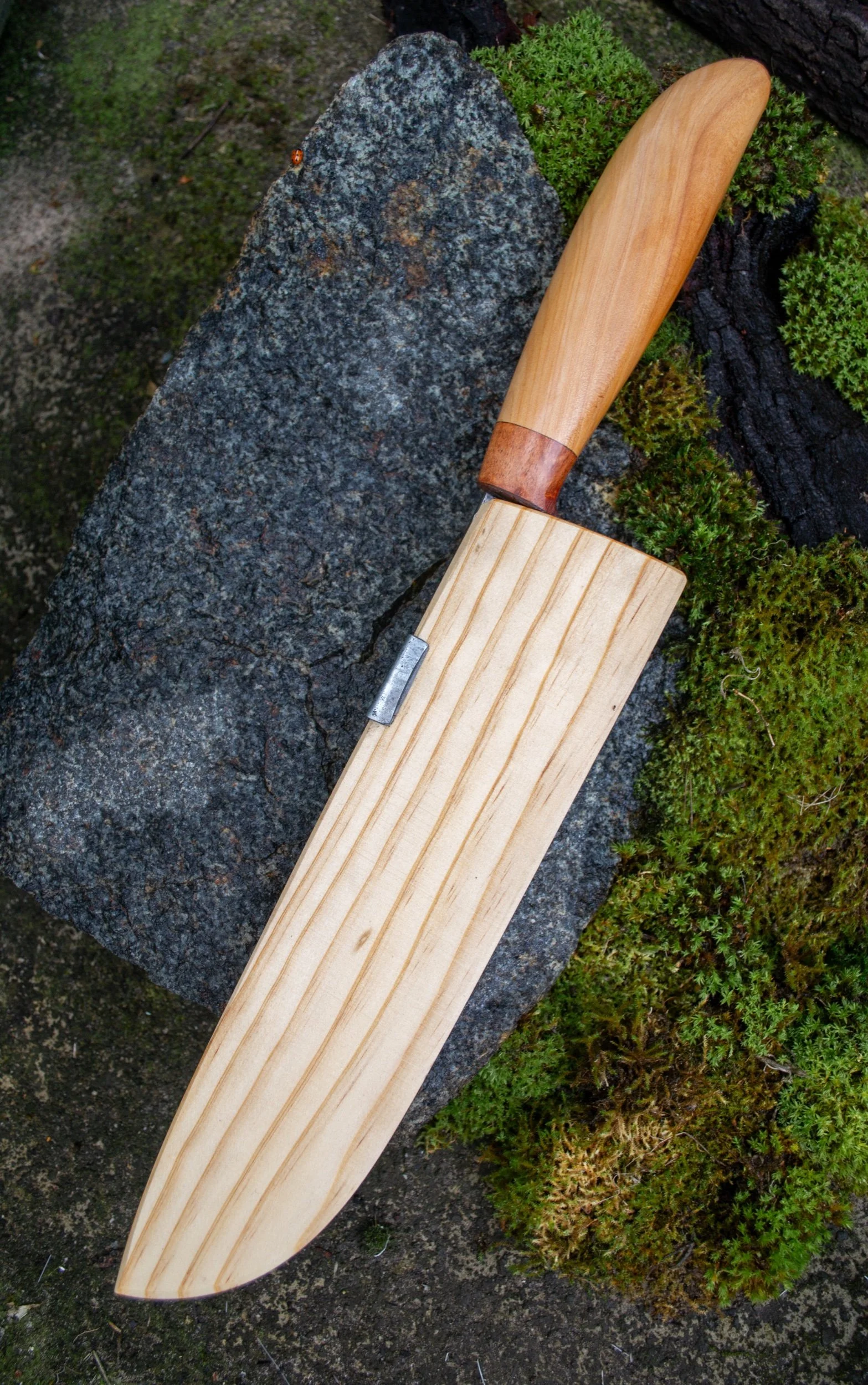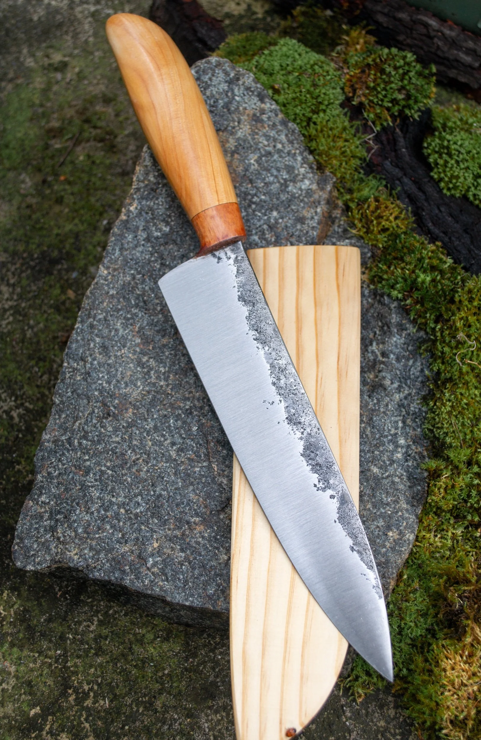 This kitchen wand has been hand forged entirely from recycled high carbon steel. It possesses a timber handle crafted from salvaged Tasmanian Celery top pine and Blackwood timber. These incredibly durable materials have been transformed into an easy to use, ergonomic kitchen knife that can be utilised to cut up many types of foods. It is not designed to cut through bone. It has a blade length of 203mm and a handle length of 145mm. It has a spine thickness of 2mm and an HRC of approximately 59-60.