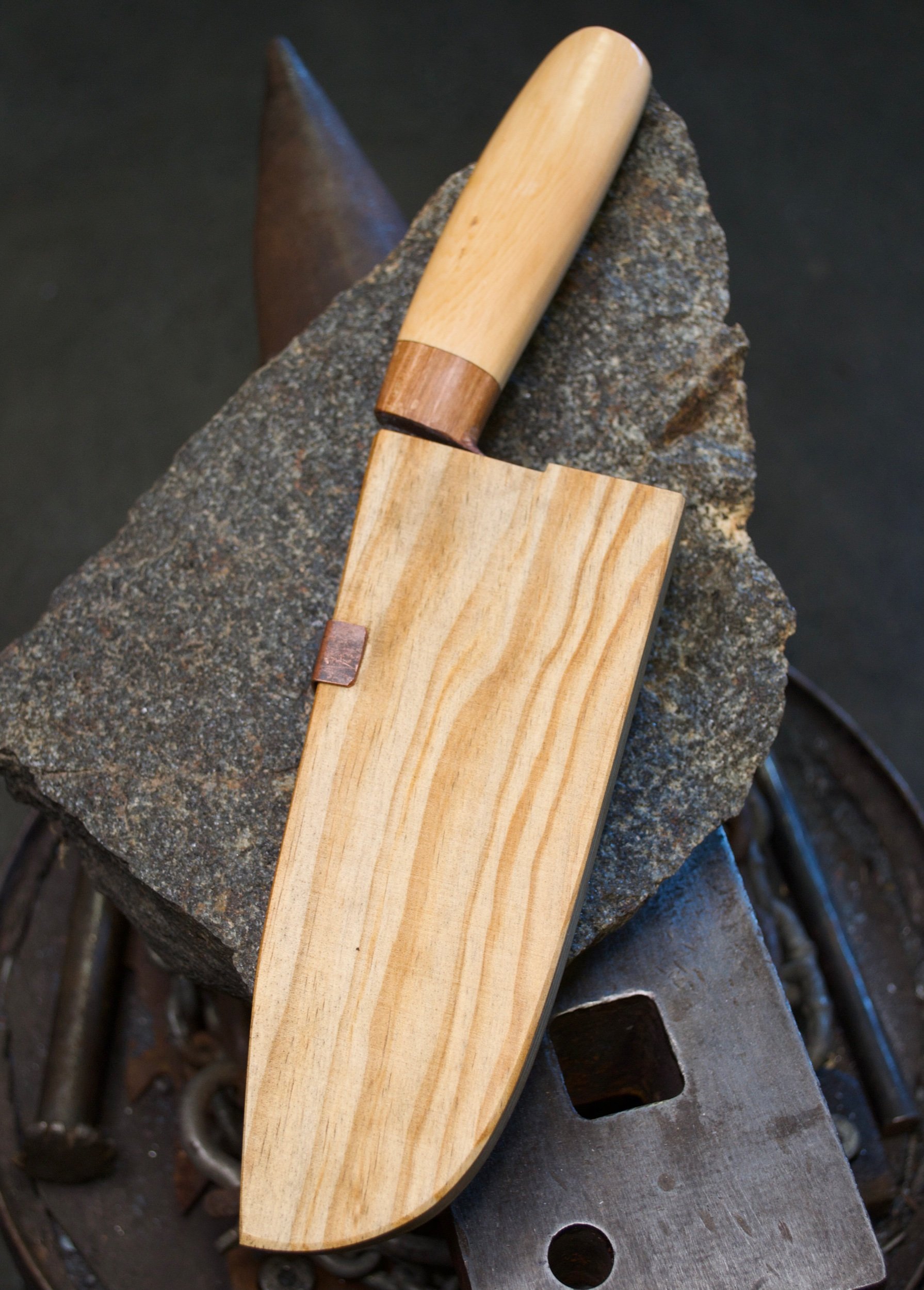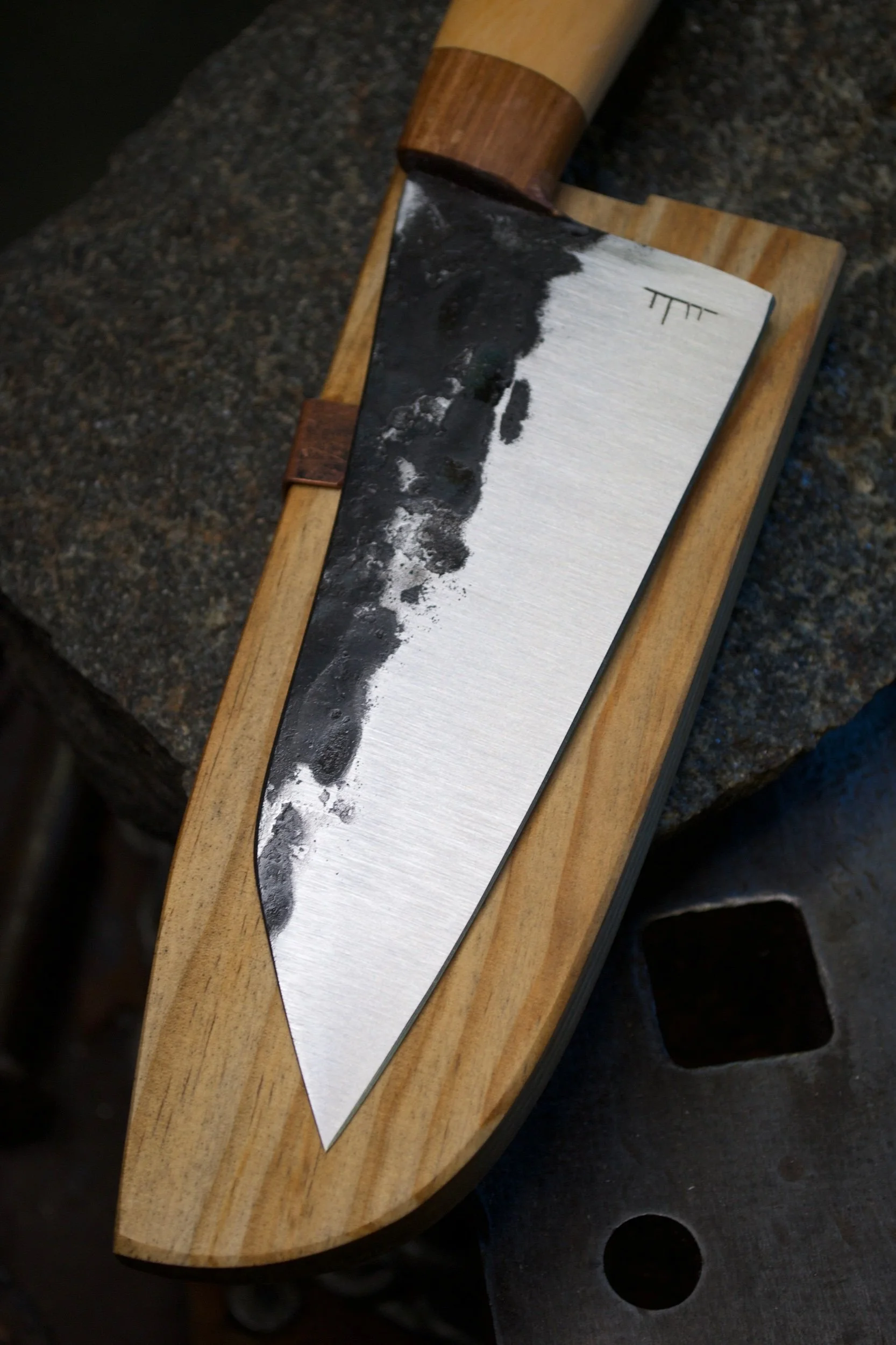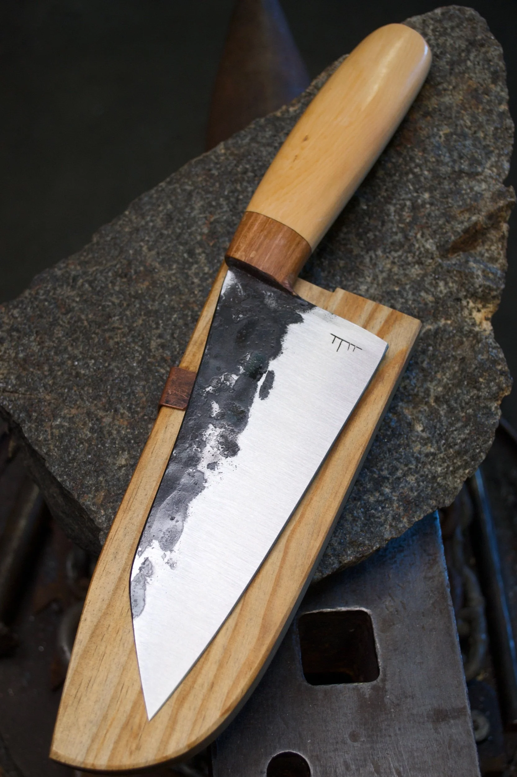 This kitchen wand has been hand forged entirely from recycled high carbon steel. It possesses a timber handle crafted from salvaged Tasmanian Myrtle beech and Huon pine timber. These incredibly durable materials have been transformed into an easy to use, ergonomic kitchen knife that can be utilised to cut up many types of foods. It is not designed to cut through bone. It has a blade length of 170mm and a handle length of 135mm. It has a spine thickness of 2mm and an HRC of approximately 59-60.